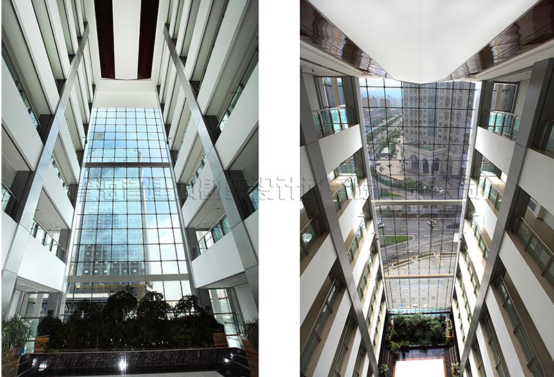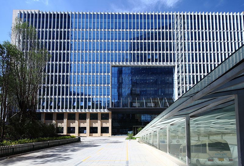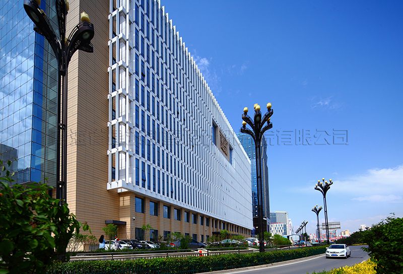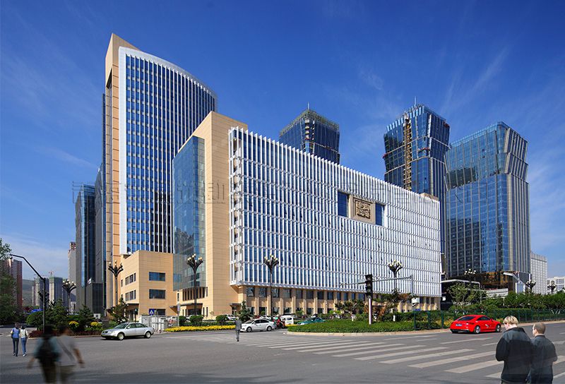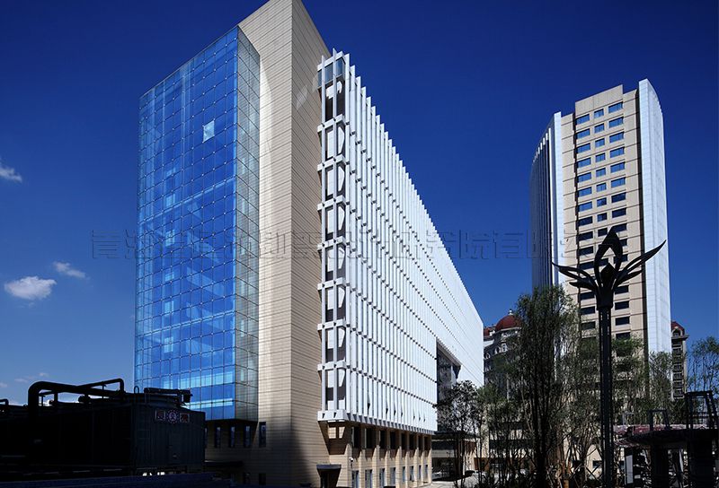 建筑體型:A區(qū)、B區(qū)一至四層為一個整體,內(nèi)部根據(jù)不同功能劃分平面。A區(qū)主樓平面呈矩形,B區(qū)主樓平面呈橄欖形,建筑立面窗采用玻璃幕墻及矩形窗的分隔方式,實體墻分為掛貼米色陶土板,立面豎向線條為鋁合金象牙白氟碳涂膜,立面設(shè)計手法現(xiàn)代、簡潔、方正、大氣,達(dá)到良好的視覺效果,幕墻與實體墻比例劃分恰當(dāng),米色陶土板墻面分格細(xì)膩,具有高品質(zhì)現(xiàn)代辦公建筑的特征,成為西寧海湖新核心區(qū)有特點的標(biāo)志建筑。