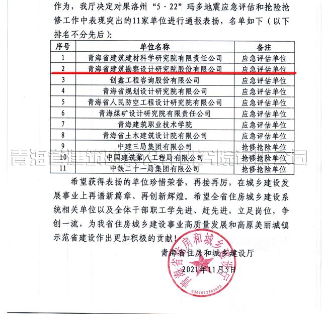 近日,青海省住建廳下發(fā)青建設(shè)[2021] 317號文件,對在果洛州“5. 22”瑪多地震抗震救災(zāi)工作中表現(xiàn)突出的11家單位和企業(yè)進行表揚通報,我公司在表揚通報之列。