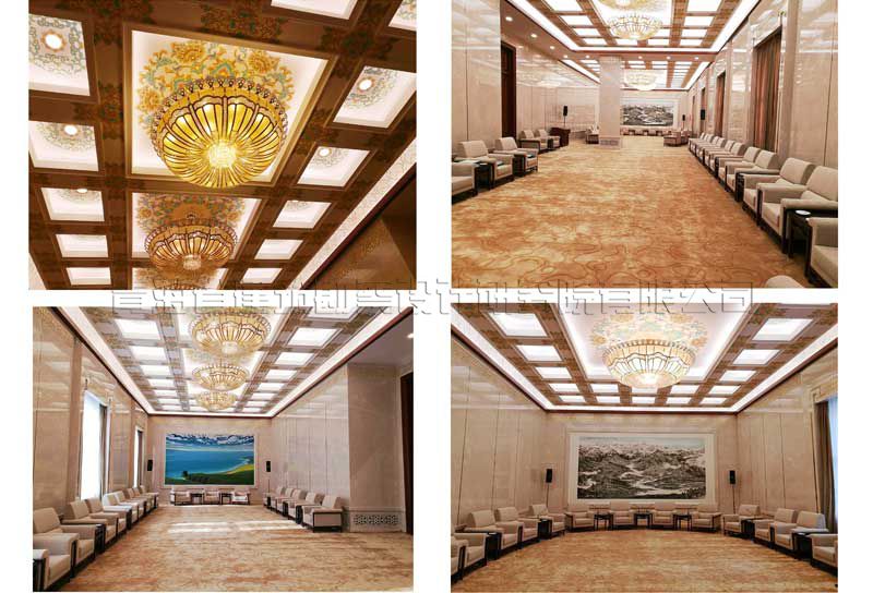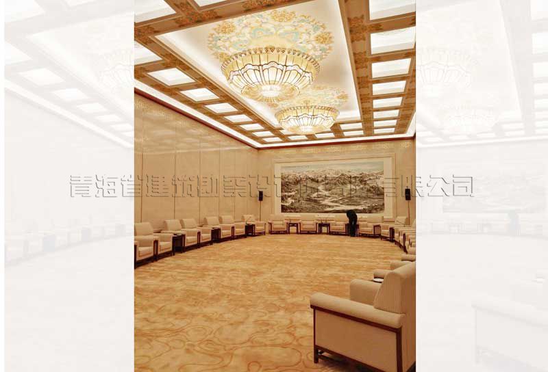 人民大會堂青海廳根據(jù)全國人民大會堂管理局安排重新調(diào)整位置,需要重新裝修改造。新青海廳位于人民大會堂Ⅱ段三層?xùn)|南角,北側(cè)與人民大會堂金色大廳和三層小禮堂相對,南側(cè)面向人大辦公樓內(nèi)院。位置與金色大廳和小禮堂位置靠近,原功能為領(lǐng)導(dǎo)人休息廳。青海廳總建筑面積350平方米,會議廳平面尺寸為29.3米×8.0米狹長的空間,建筑內(nèi)表面積為222.68平方米,廳內(nèi)原設(shè)計(jì)設(shè)變形縫,中間約2/5處設(shè)框架柱,吊頂高度5.0米左右,周邊設(shè)有服務(wù)間、衛(wèi)生間、配電間等服務(wù)設(shè)施。原裝修為2000年裝修改造工程。廳室尺寸為一狹長空間,長寬比達(dá)到1:3.67,空間比例很不協(xié)調(diào),為改造裝修工程帶來較大的難度,也是改造工程的重點(diǎn)。