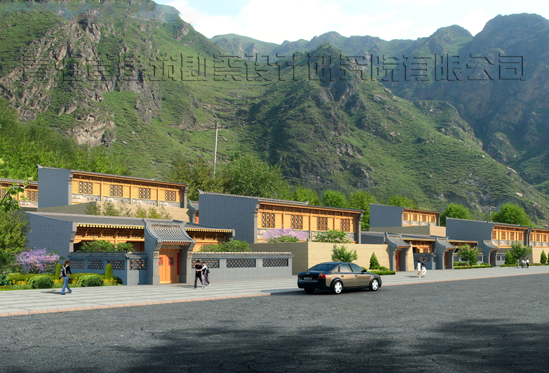 建筑窗框、檐口檀條、椽條等顏色涂成仿木色,強調(diào)傳統(tǒng)民居的木結(jié)構(gòu)特色。